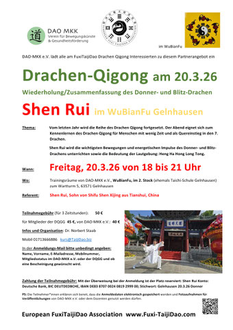 Für alle, die Drachen-Qigong erstmal spontan kennenlernen möchten, besteht 2026 wieder an zwei Freitagen die Möglichkeit über drei Stunden mit dem deutsch/englisch sprechenden chinesischen Qigong- und Taiji-Lehrer Shen Rui zu üben.