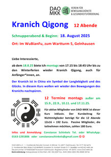 Unten finden Sie/findest Du die Flyer unserer neuen Wochenkurse, welche für aktive Mitglieder inklusiv im Mitgliedsbeitrag enthalten sind. Von passiven Mitgliedern können sie vergünstigt sowie von Nichtmitgliedern einzeln gebucht werden. Die aktuellen Termine finden sich auch unter: www.DAO-MKK.de